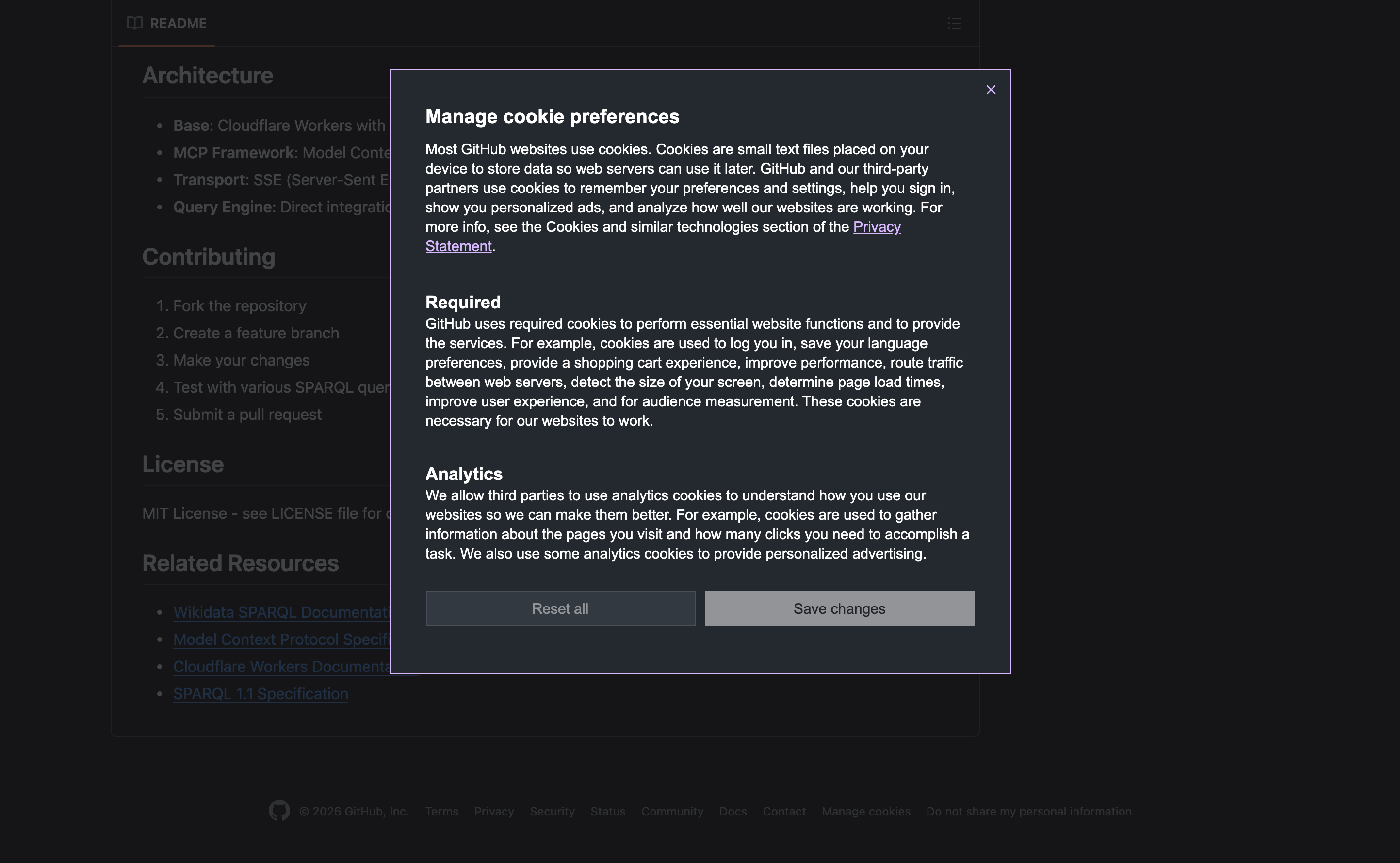 Unofficial REMOTE MCP server for Wikidata's SPARQL endpoint, providing access to structured knowledge data, entity relationships, and semantic queries for research and data analysis.