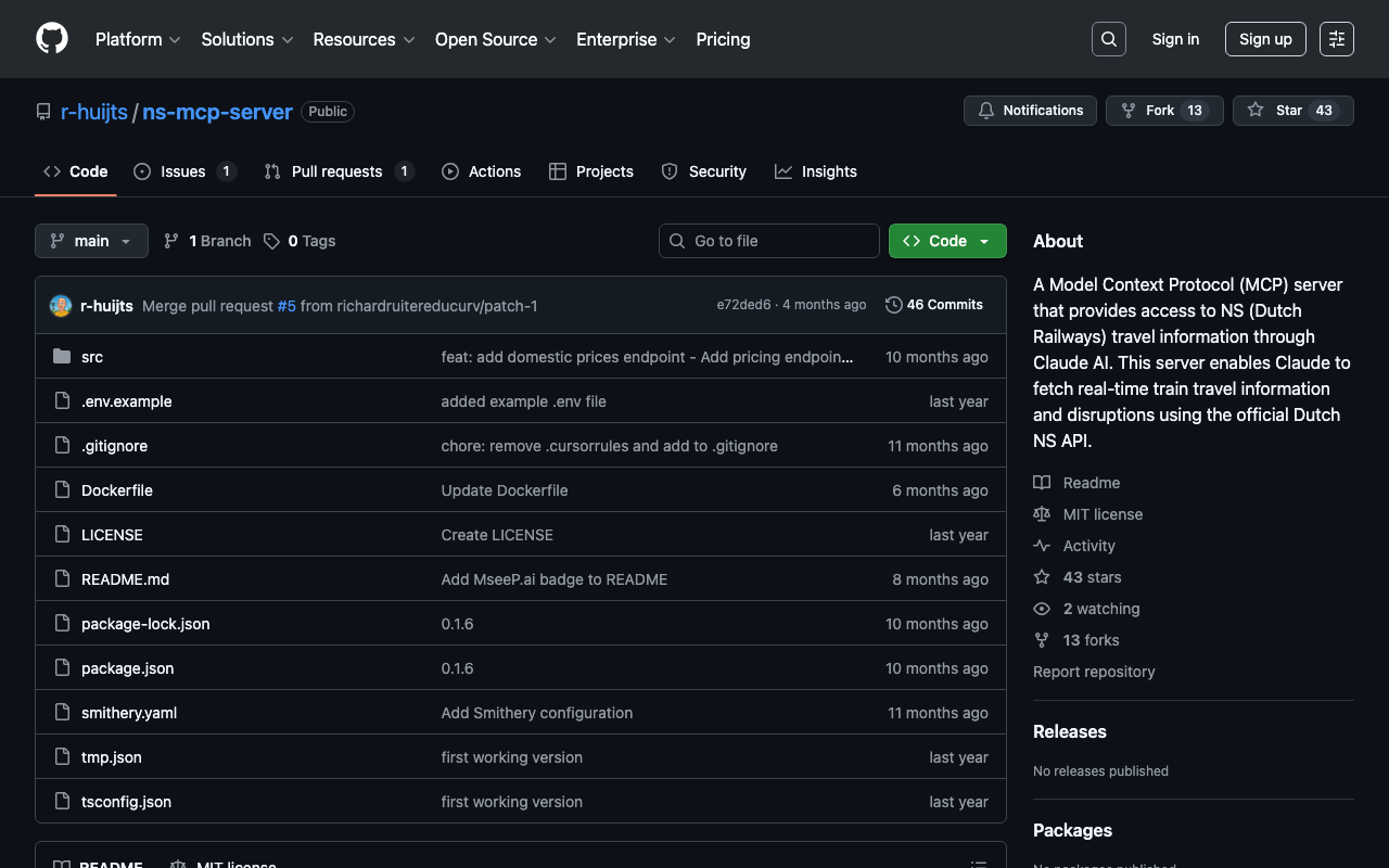 A Model Context Protocol (MCP) server that provides access to NS (Dutch Railways) travel information through Claude AI. This server enables Claude to fetch real-time train travel information and disruptions using the official Dutch NS API.