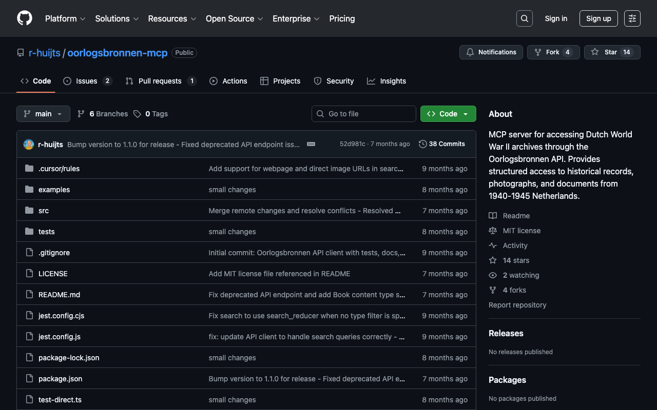 MCP server for accessing Dutch World War II archives through the Oorlogsbronnen API. Provides structured access to historical records, photographs, and documents from 1940-1945 Netherlands.