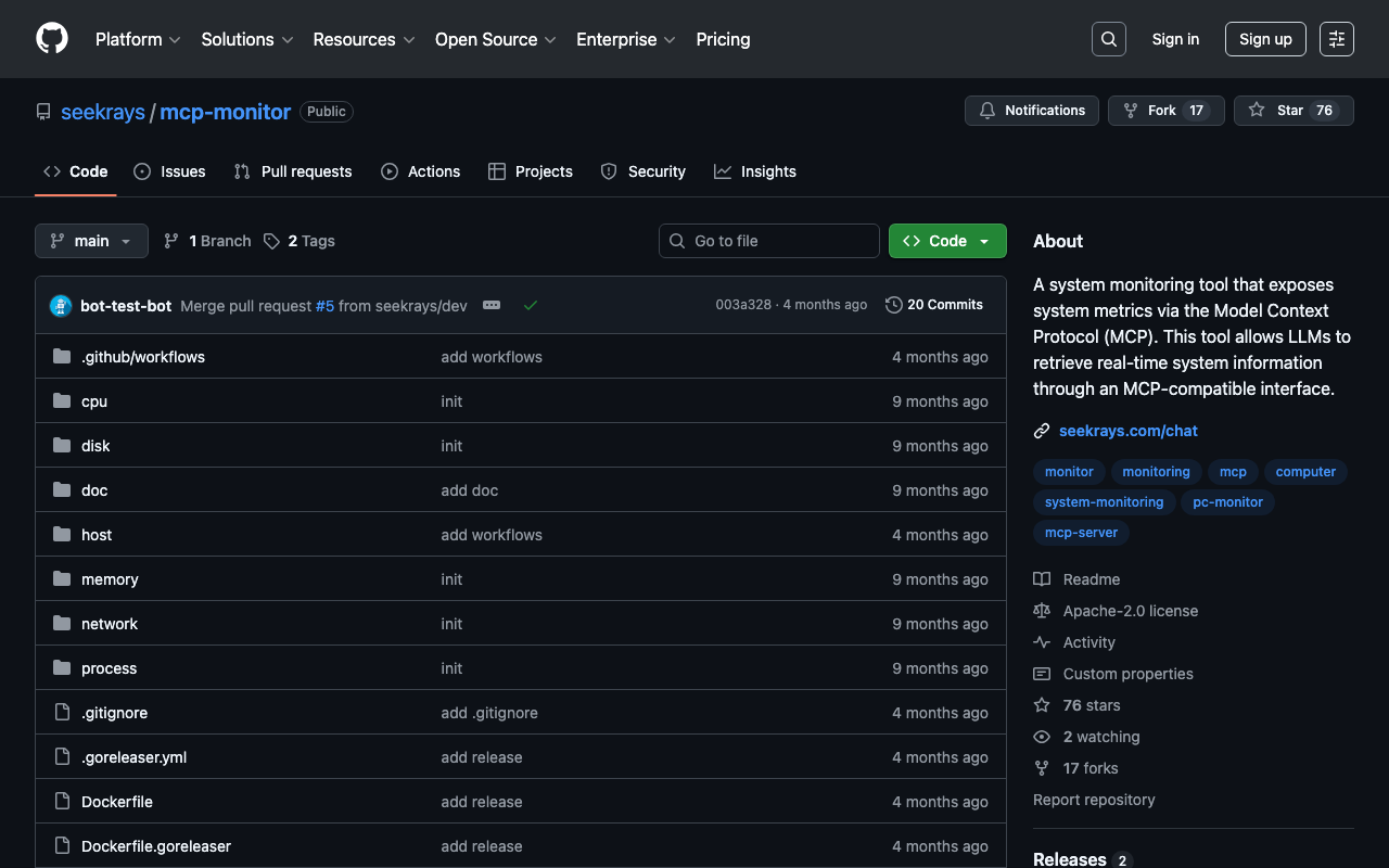 A system monitoring tool that exposes system metrics via the Model Context Protocol (MCP). This tool allows LLMs to retrieve real-time system information through an MCP-compatible interface.