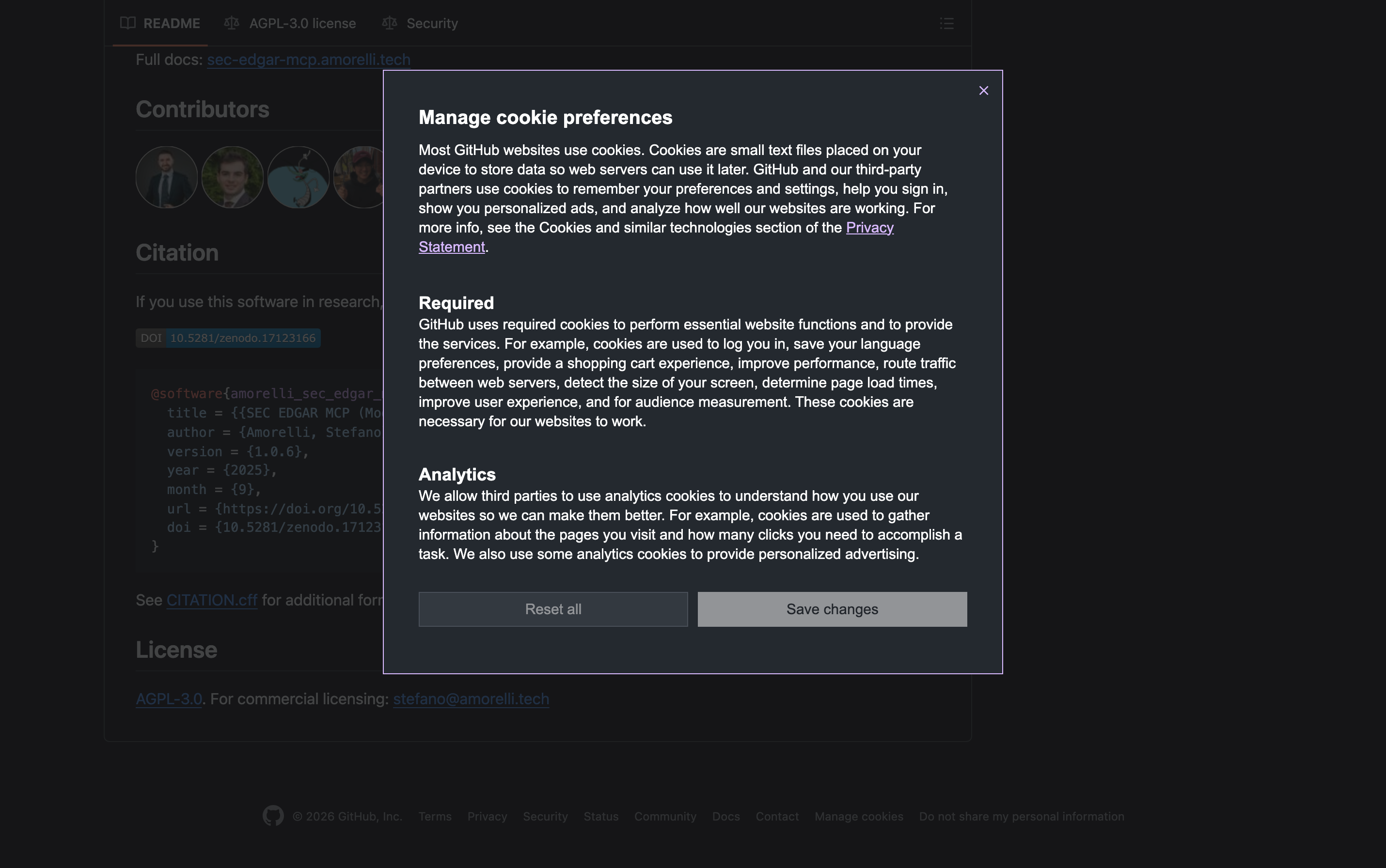 (by Stefano Amorelli) A community Model Context Protocol Server to access financial filings and data through the U.S. Securities and Exchange Commission ([SEC](https://www.sec.gov/)) `Electronic Data Gathering, Analysis, and Retrieval` ([EDGAR](https://www.sec.gov/submit-filings/about-edgar)) database