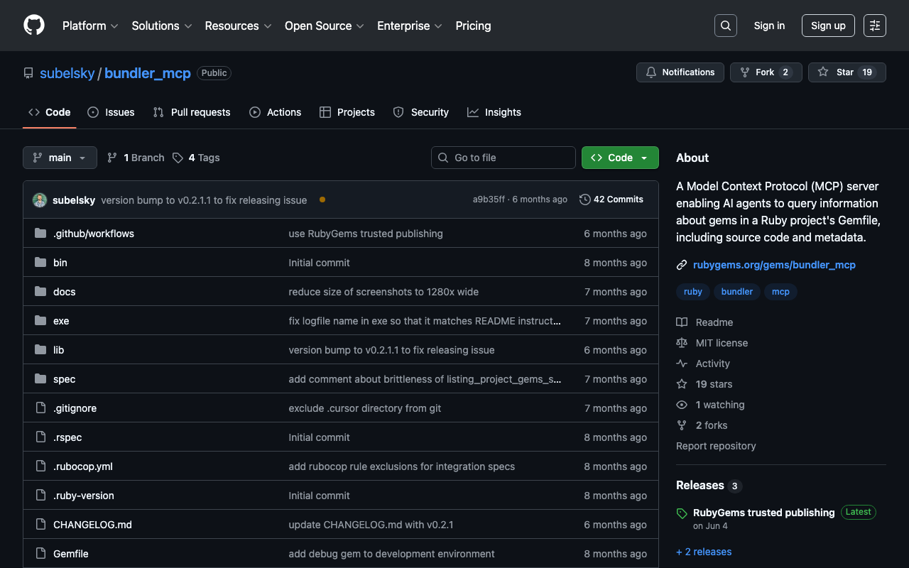 A Model Context Protocol (MCP) server enabling AI agents to query information about gems in a Ruby project's Gemfile, including source code and metadata.