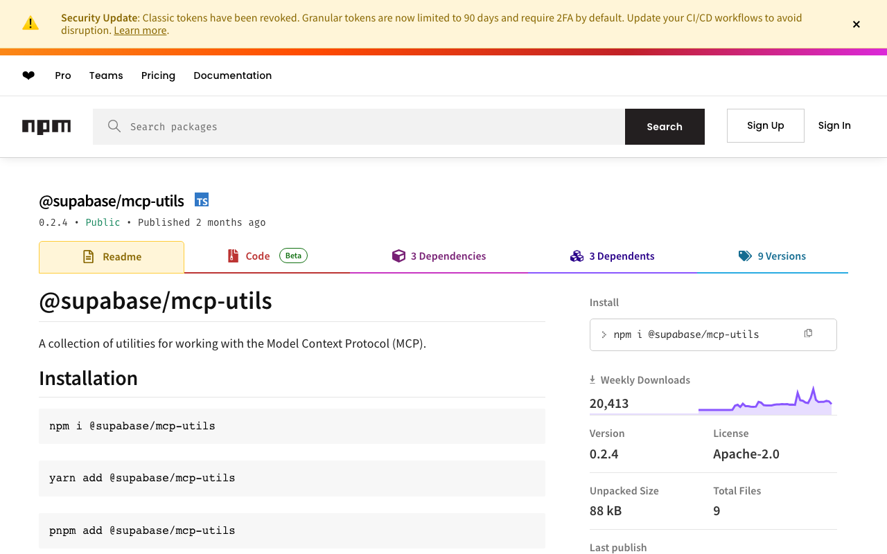 MCP server that extends Claude's capabilities with @supabase/MCP utils integration. Enables seamless interaction between Claude and @supabase/MCP utils services through the Model Context Protocol.