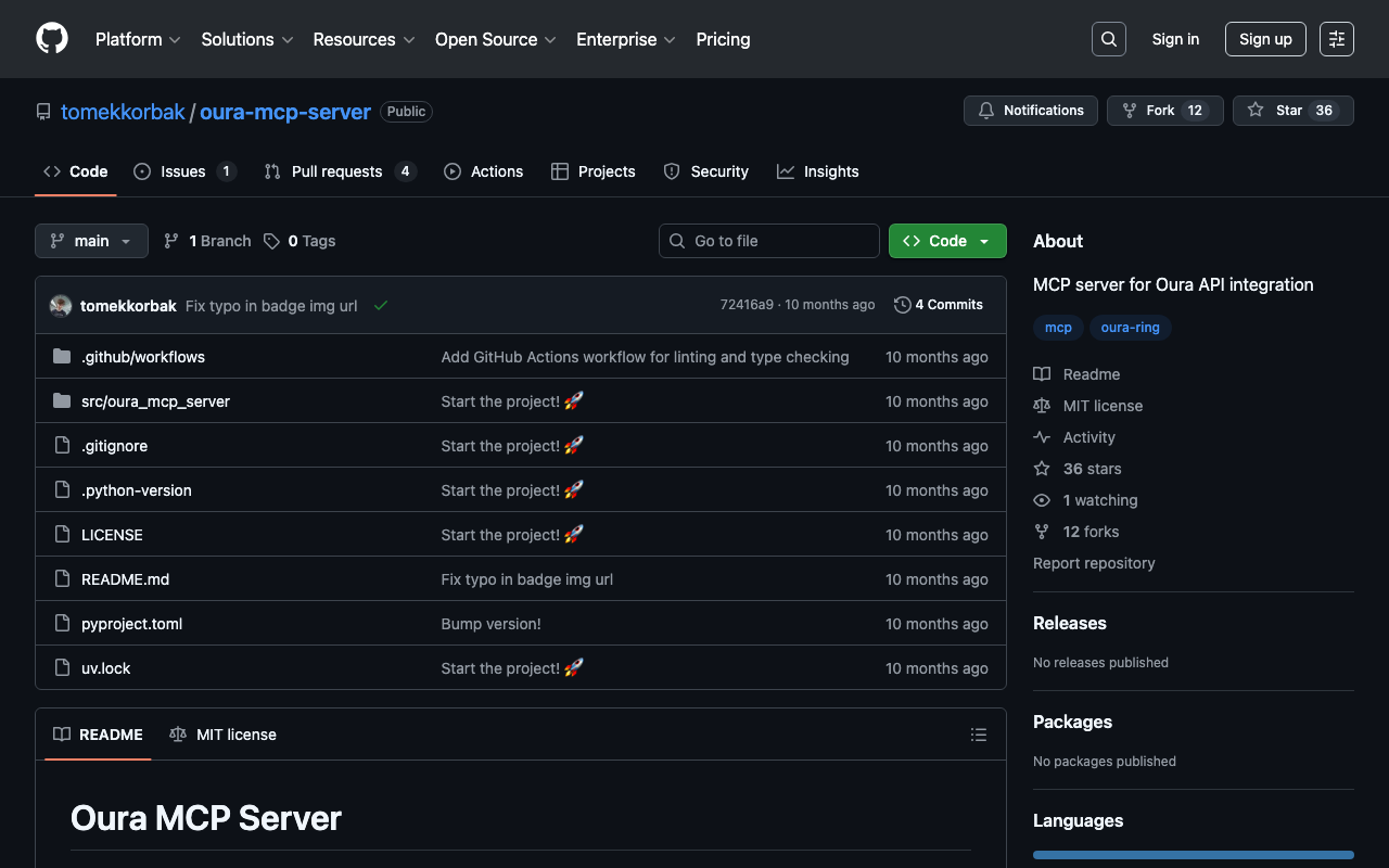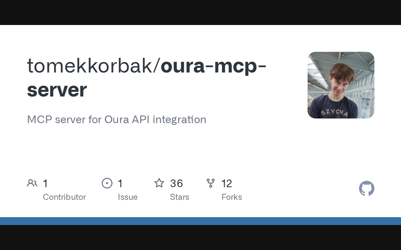 Extend Claude with tomekkorbak oura mcp server capabilitiesIntegrate external data into AI conversationsAutomate workflows combining Claude with specialized servicesBuild custom AI-powered development tools