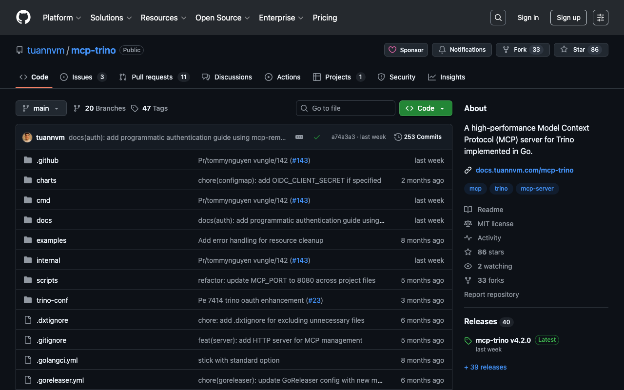 Extend Claude with tuannvm mcp trino capabilitiesIntegrate external data into AI conversationsAutomate workflows combining Claude with specialized servicesBuild custom AI-powered development tools