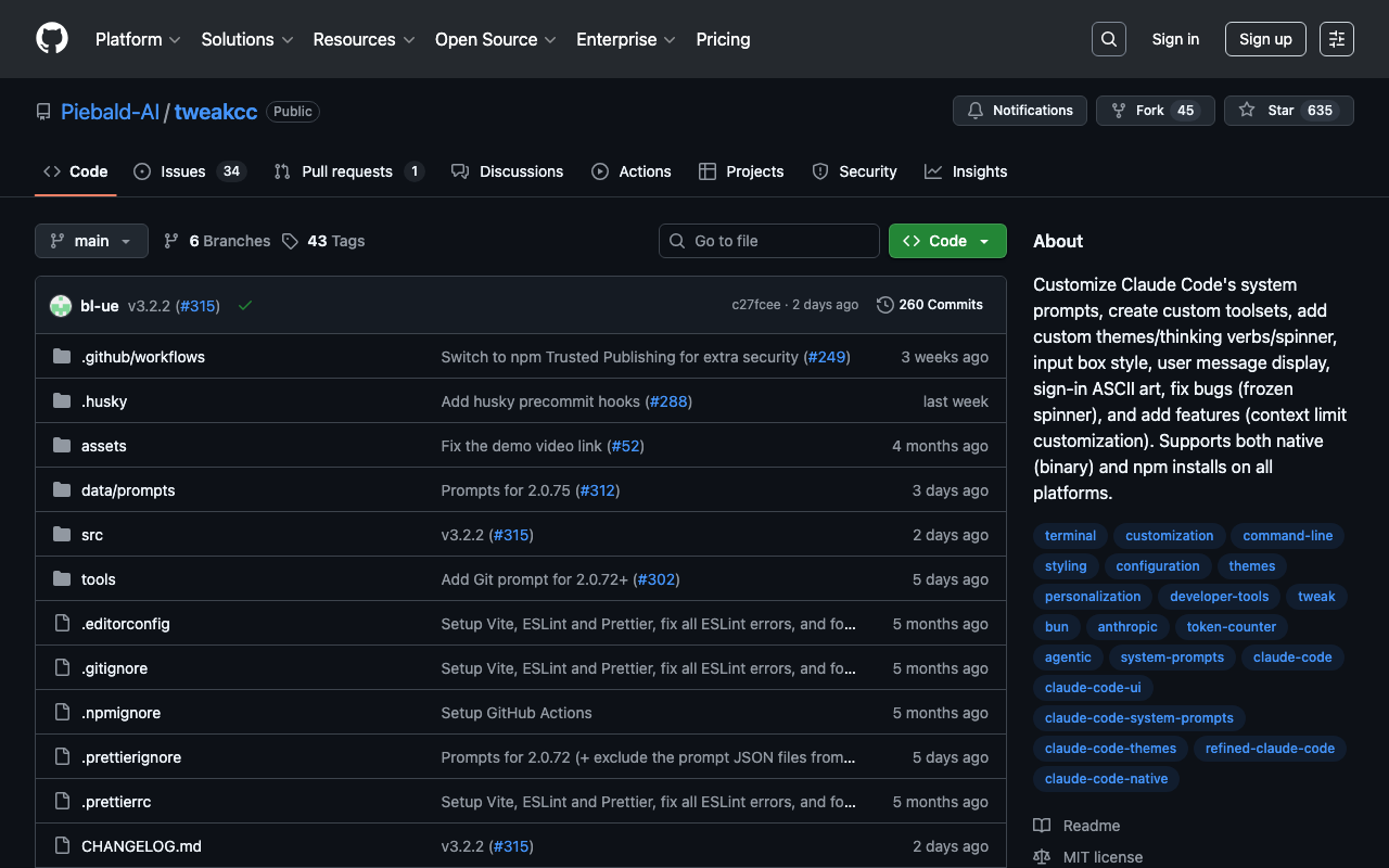 Customize Claude Code's system prompts, create custom toolsets, add custom themes/thinking verbs/spinner, input box style, user message display, sign-in ASCII art, fix bugs (frozen spinner), and add features (context limit customization). Supports both native (binary) and npm installs on all platforms.