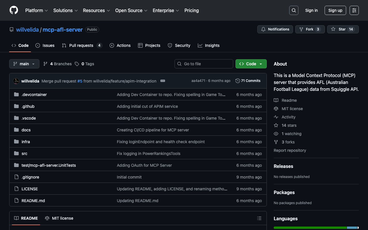 Extend Claude with willvelida mcp afl server capabilitiesIntegrate external data into AI conversationsAutomate workflows combining Claude with specialized servicesBuild custom AI-powered development tools