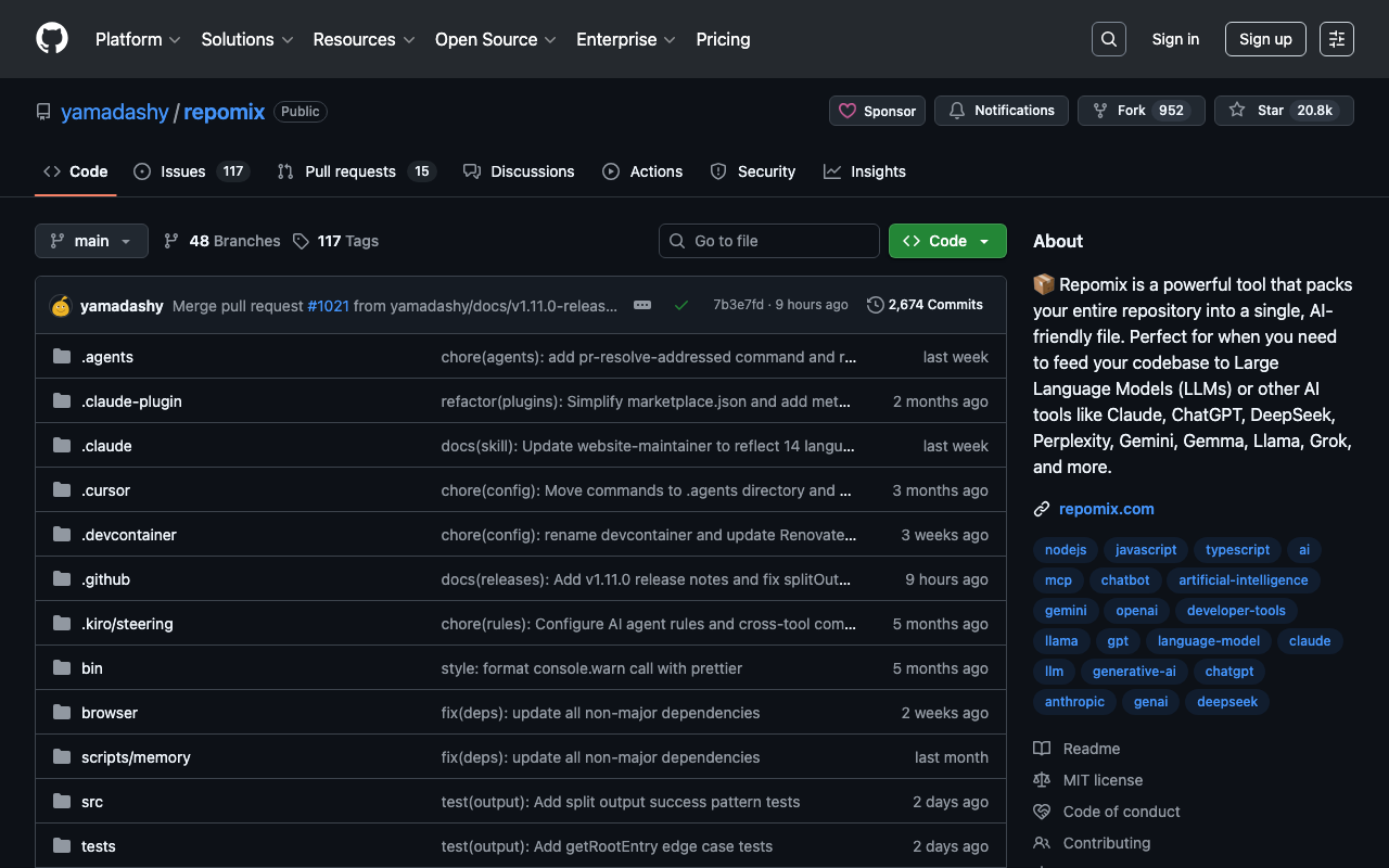 π¦ Repomix is a powerful tool that packs your entire repository into a single, AI-friendly file. Perfect for when you need to feed your codebase to Large Language Models (LLMs) or other AI tools like Claude, ChatGPT, DeepSeek, Perplexity, Gemini, Gemma, Llama, Grok, and more.